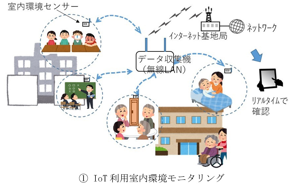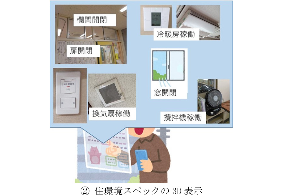 新型コロナウイルス感染症を経験し、室内環境管理の重要性は高まっている。感染症拡大時、通常時の両方の状況に対応できるフェーズフリーの室内環境管理は、postコロナにおいて重要な要素である。空調管理者が常駐し、適切な空気質制御が行われている大規模建築以外の、学校、高齢者施設などの中規模建築では、室内環境の管理は専門知識をもたない在室者に任されている。そのような中規模建築では、十分な換気量を有する機械換気設備があるにもかかわらず、常時窓開けを行い、冷暖房費が増大する事例が報告されている。その背景には、建築の平面計画や設備計画ごとに異なる住環境制御のしくみが、専門知識のない在室者に伝わっていないこと、すなわち住環境システムのアフォーダンスが不足していることがある。そこで、各施設の平面計画、窓・戸・欄間設置状況、換気設備のスペック等の360°画像を作成し、室内環境(温湿度、CO2濃度、照度)のリアルタイムモニタリングとリンクさせ「住環境デジタルツイン」として、在室者の室内環境調節行動の手助けとなるシステムを構築する。①IoT利用室内環境モニタリング+②住環境スペックの3D表示=住環境デジタルツインである。