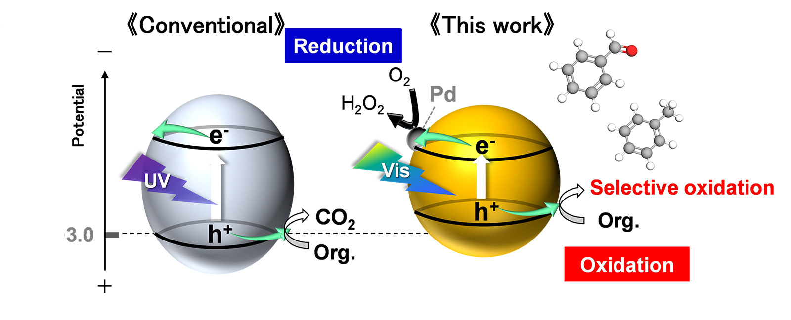 The light-induced organic synthesis using semiconductor photocatalysts is a promising approach due to its significant advantages of operation under mild conditions and utilization of clean, renewable solar light as the driving force, TiO2 is one of the most widely studied photocatalysts; however, the low selectivity for partial oxidation due to the complete decomposition to CO2 and lack of utilization of visible-light hampers its practical application. Therefore, the objective of this research is to develop a photocatalyst that utilizes visible light as a reaction source and enables selective partial oxidation.