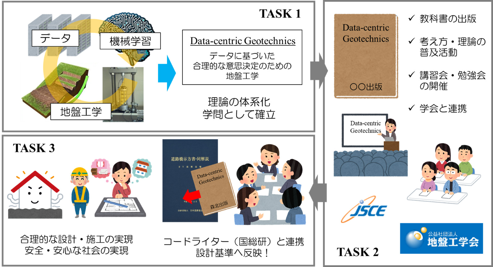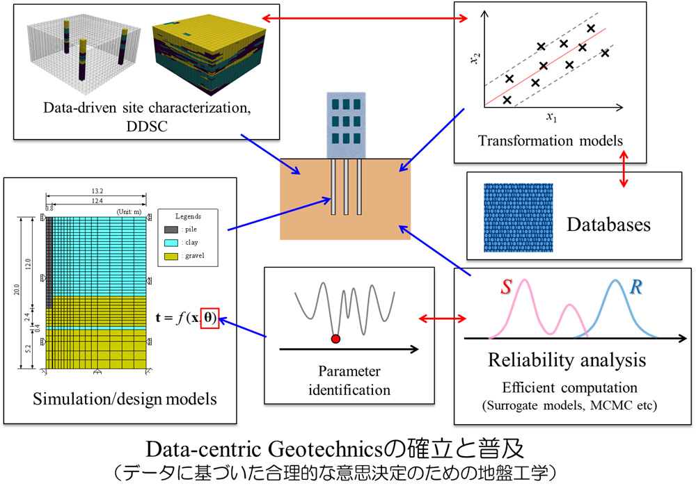 データ・機械学習に基づく合理的な意思決定を可能にする地盤工学「Data-centric Geotechnics」を体系化し,新しい学問として確立するとともに,その新しい概念を高等教育および実務に浸透させるための仕組みづくりに取り組む.具体的には,①現在,全世界で取り組まれている地盤工学におけるデータサイエンス,機械学習に関連する技術・研究を整理・統合し,Data-centric Geotechnicsを学問として体系化する,②従来の土質力学および地盤工学の教科書に代わりうる,Data-centric Geotechnicsの教科書(和書)を新たに出版するとともに,公益社団法人土木学会および地盤工学会と協働し,講習会・勉強会を通した人材育成を行う,③設計基準のコードライター,および国土総合技術研究所と連携し,最新の研究成果を設計基準に取り入れるための活動を行う.また,現行の基準を「データおよび機械学習の活用を前提とした設計基準」へとアップデートするために,講習会・勉強会を開催し,普及活動につとめる.