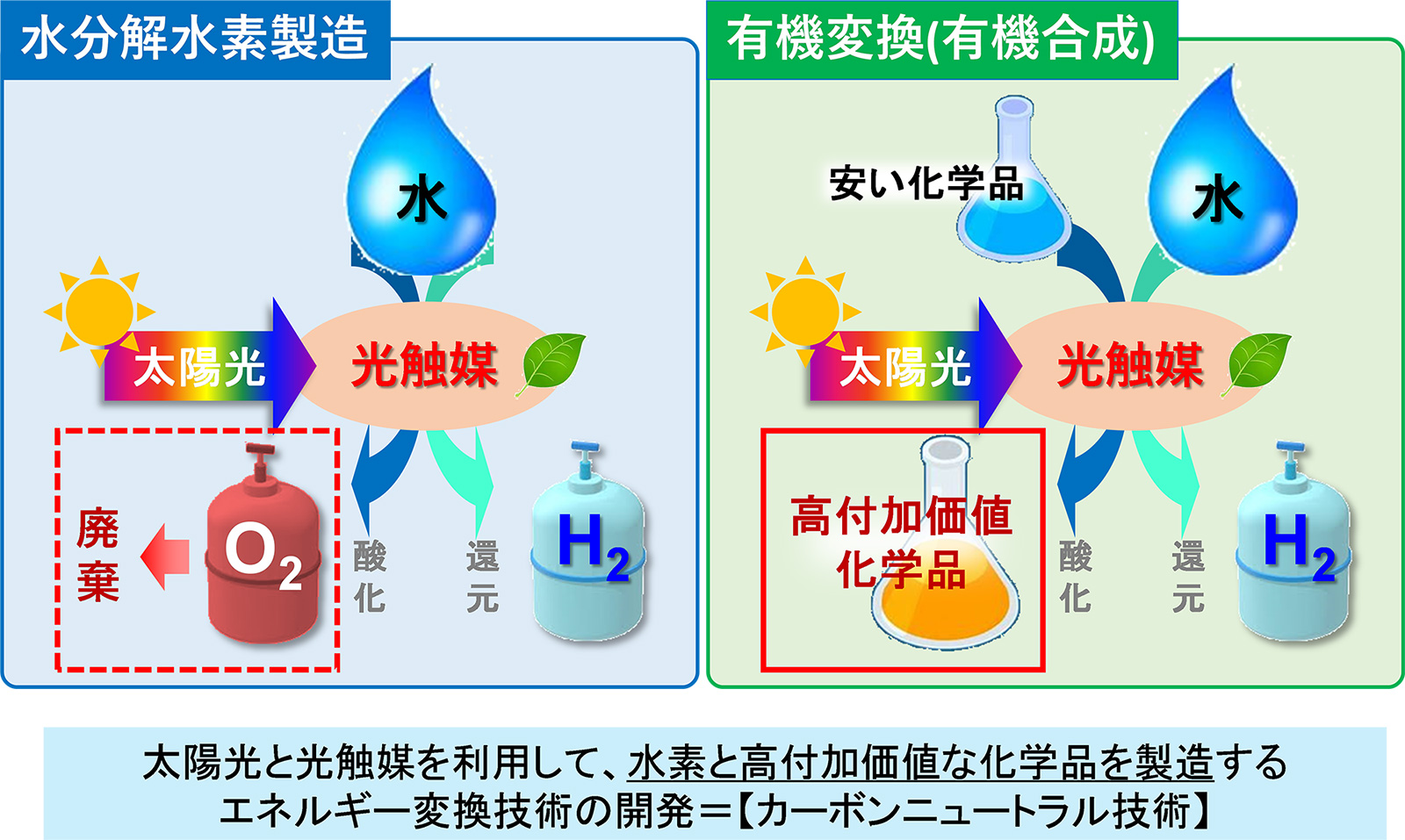 半導体光触媒による水分解水素製造は、無尽蔵な太陽光を利用したエネルギー変換技術として期待されています。本研究は、この技術を発展させ、可視光を照射することで生成する電子を用いた水素製造と同時に、正孔を用いた酸化反応で、酸素に比べて高付加価値な有機化学品を合成することを目指しています。一般的な酸化物光触媒は、可視光には応答しない上、それらを用いて選択酸化を実現することは困難です。本研究では、可視光に応答する光触媒を合成・利用し、それらに適した助触媒の組合せを見出すことで、太陽光を利用した選択酸化反応の実現を試みます。